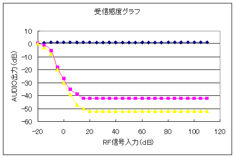 黄色は、無変調の希望信号を加えていったときの復調出力を測定しています。