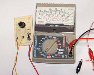 電流を測定している様子。右下にLEDがあります。