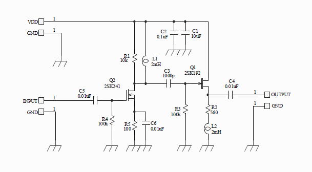 回路は下記のようになります。2SK241と2SK192の2段アンプです。
